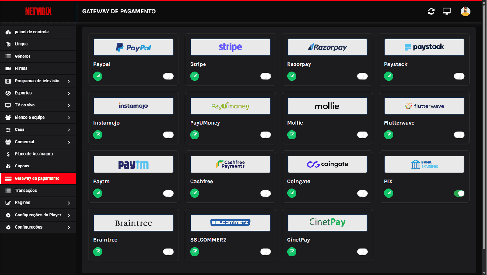 Gateway de pagamento (Pagamento Braintree para PayPal, Stripe, Razorpay, PayStack, Instamojo, PayUMoney, Flutterwave, Paytm, Cashfree, Mollie, Coingate, SSLCOMMERZ e CinetPay)