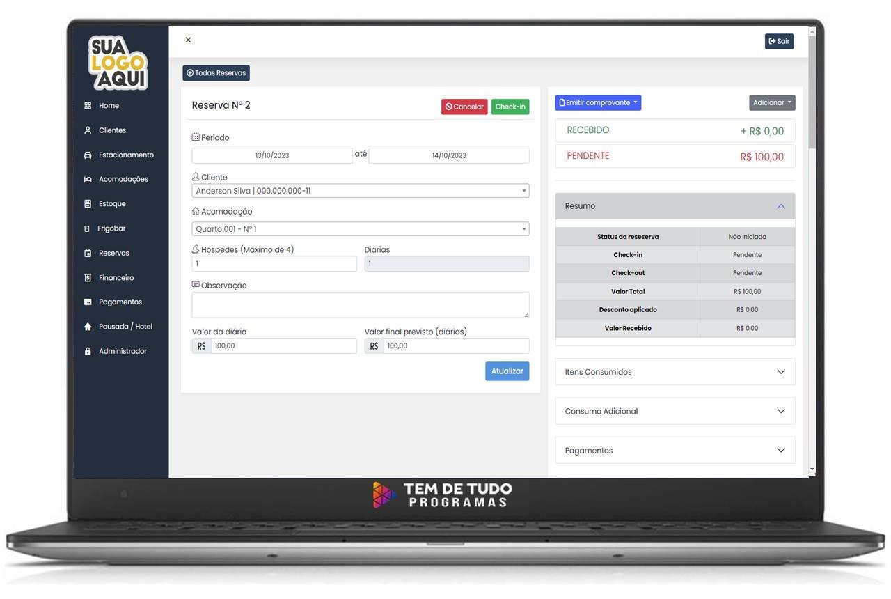 • Reservas: Você pode verificar a disponibilidade de quartos entre determinados dias. É possível vincular o cliente a reserva na hora do cadastro de reservas e depois adicionar consumos. Possuindo um sistema de check-in e check-out simplificado é possível gerenciar suas reservas de forma fácil e rápida.
