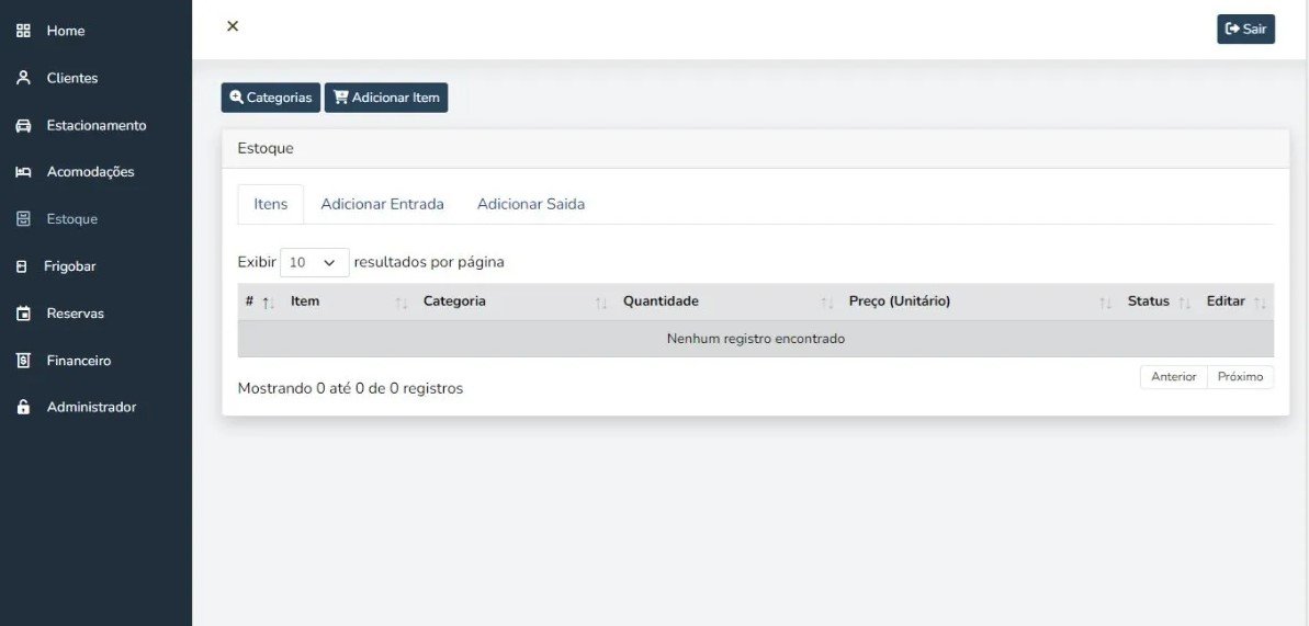 • Estoque: É possível adicionar itens ao estoque, realizar entradas e saidas de itens.