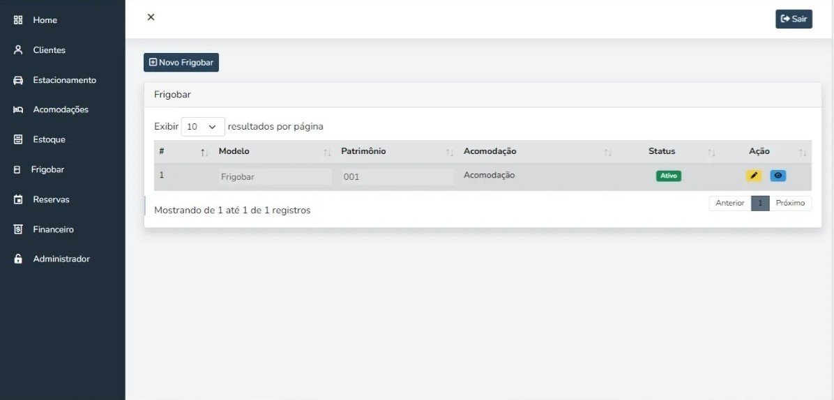 • Frigobar: O sistema contém controle de frigobar. É possível cadastrar um ou mais frigobares para uma acomodação. Você pode retirar itens do estoque e adicionar dentro do frigobar, para posteriormente esse item ser consumido pelo cliente.