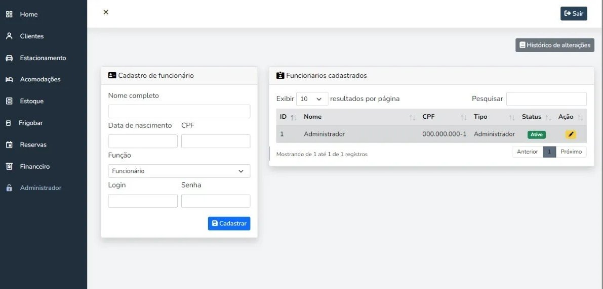 Em nosso sistema é possível cadastrar clientes, vagas no estacionamento, acomodações e frigobares.